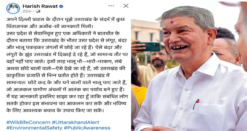 रावत ने अपने सोशल मीडिया पर एक पोस्ट साझा कर लिखा है कि ‘अपने दिल्ली प्रवास के दौरान मुझे उत्तराखंड के संदर्भ में कुछ चिंताजनक और अजीब सी जानकारी मिली. जिसमें उत्तर प्रदेश से सेवानिवृत्त हुए एक अधिकारी ने बातचीत के दौरान बताया कि उत्तराखंड के अंदर उत्तर प्रदेश से लंगूर, बंदर और भालू पकड़कर जंगलों में छोड़े जा रहे हैं. ऐसे बंदर और लंगूरों के झुंड उत्तराखंड में दिखाई दे रहे हैं, जो सामान्य तौर पर वहां नहीं पाए जाते.’