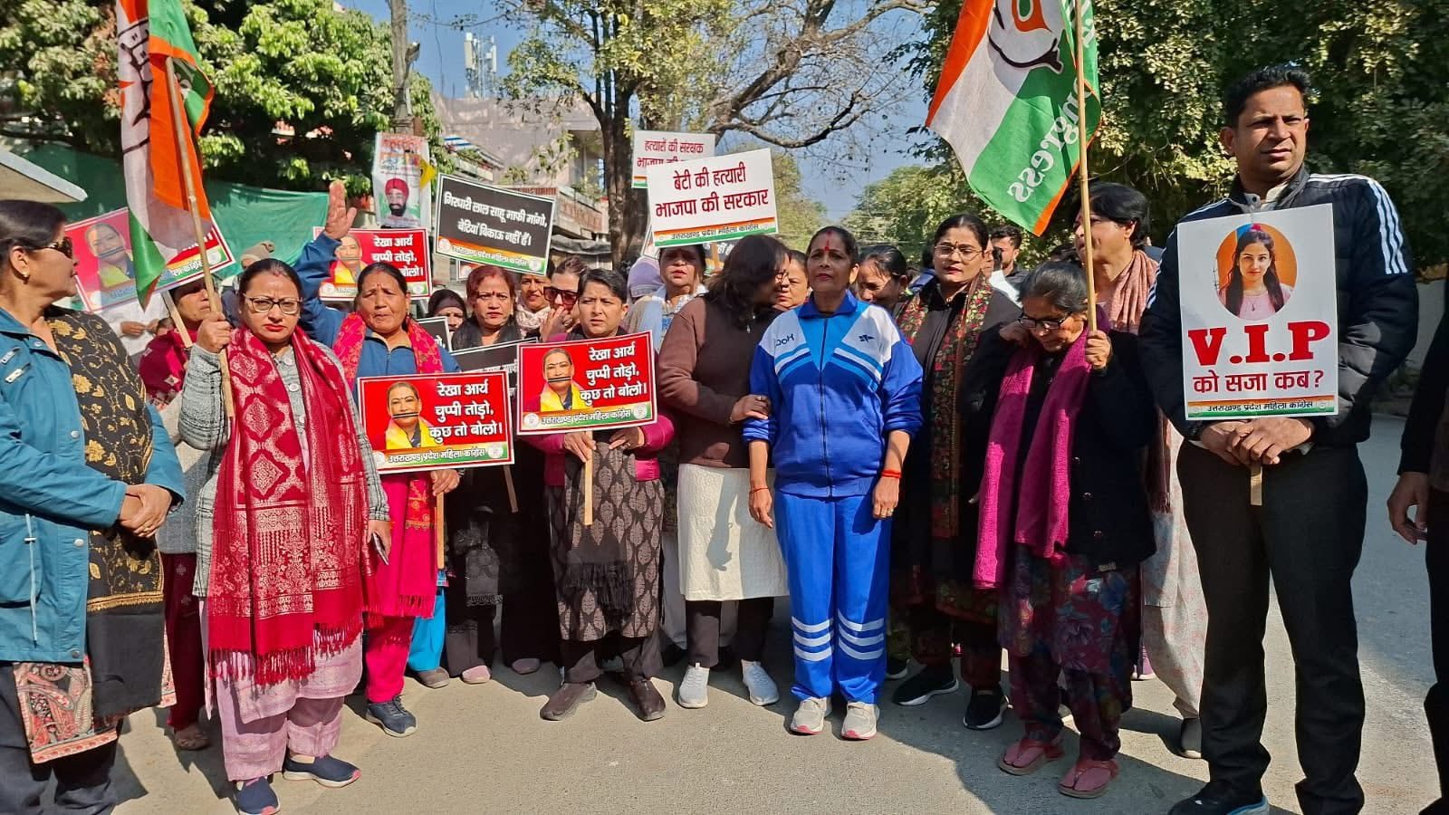 महिला कांग्रेस के कार्यकर्ता प्रदेश अध्यक्ष ज्योति रौतेला के नेतृत्व में यमुना कॉलोनी गेट पर एकत्र हुए जहां से नारेबाजी करते हुए मंत्री रेखा आर्य के आवास की ओर कूच किया।प्रदेश महिला अध्यक्ष ज्योति रौतेला ने कहा कि अंकिता भंडारी हत्याकांड को तीन वर्ष हो चुके हैं परन्तु अभी तक उसे न्याय नहीं मिल पाया है क्योंकि हत्याकांड में जिस वीआईपी का जिक्र हुआ था वह नाम भाजपा के राष्ट्रीय महामंत्री और उत्तराखंड प्रभारी के रूपमे सामने आया है। उन्होंने यह भी कहा कि पिछले वर्षों में राज्य में जितने भी महिला अपराध के मामले सामने आये हैं उनमें भाजपा नेताओं की संलिप्तता जग जाहिर है उल्टे पुलिस द्वारा पीड़ितों को ही प्रताड़ित करने का काम किया है।