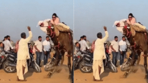 वीडियो की शुरुआत में देखा जा सकता है कि विदेशी जोड़ा ऊंट पर चढ़ने की कोशिश कर रहा है.शुरुआत में सब नॉर्मल लगता है, ऊंट भी शांति से खड़ा रहता है. दोनों ऊंट पर बैठते हैं, लेकिन तभी ऊंट अचानक उछलने लगता है और अपना संतुलन खो देता है. इससे पहले कि कोई कुछ समझ पाता, ऊंट जोर से हिलता है और दोनों सवार नीचे गिर जाते हैं.गिरने का अंदाज ऐसा था जैसे किसी ने एकदम झूले से नीचे धक्का दे दिया हो. वहां मौजूद लोग पहले तो डर गए. वहीं गिरने के बाद महिला काफी देर तक उठ नहीं पाती, क्योंकि ऊंट से गिरना कोई मामूली बात नहीं, यह लगभग एक मंजिला इमारत की ऊंचाई से गिरने जैसा होता है. आसपास मौजूद लोग तुरंत भागकर उनकी मदद करते हैं.