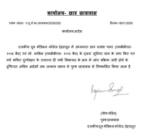 इस प्रकरण में राजकीय दून मेडिकल कॉलेज मे पुरुष छात्रावास के चीफ वार्डन ने दो छात्रों को छात्रावास से निष्कासित कर दिया है. उन्होंने 2023 और 2024 बैच के दो छात्रों के द्वारा जूनियर छात्र के साथ किए गए कथित दुर्व्यवहार के बाद दी गई शिकायत के आधार पर जांच प्रक्रिया जारी होने के मद्देनजर पुरुष छात्रावास से निष्कासित किया है.