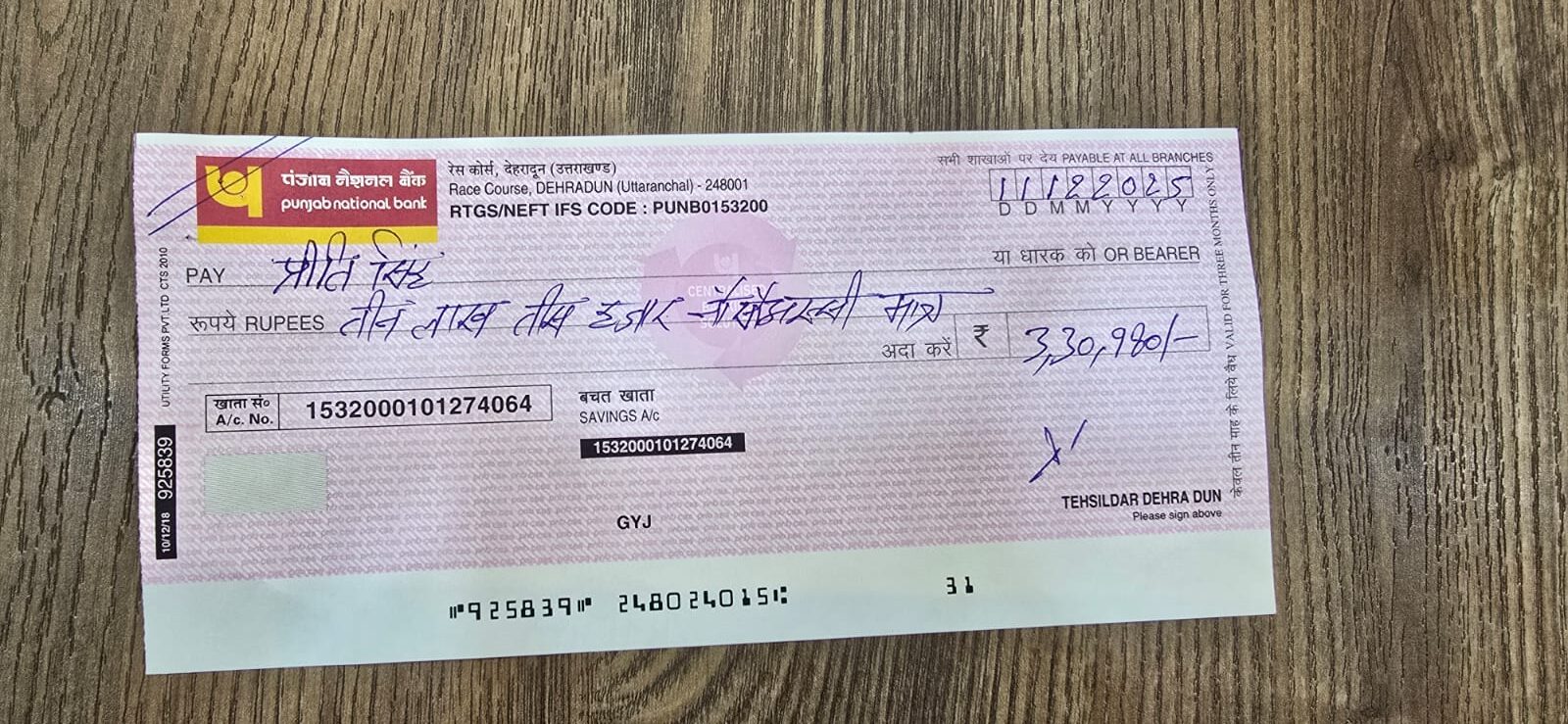 जिलाधिकारी का हस्तक्षेप पीड़िता की शिकायत सुनने के बाद जिलाधिकारी सविन बंसल ने मामले को गंभीरता से लेते हुए उप जिलाधिकारी (न्याय) कुमकुम जोशी को तत्काल जांच एवं आवश्यक कार्रवाई के निर्देश दिए। जिला प्रशासन द्वारा जांच में पाया गया कि बीमा क्लेम राशि प्राप्त होने के बाद भी बैंक द्वारा अनुचित रूप से धनराशि की मांग की जा रही थी। इस पर बैंक की रू0 3,30,980 की आरसी काटी गई। आरसी कटते ही बैंक ने 24 घंटे के भीतर नामिनी प्रीति सिंह के नाम 3.30 लाख रुपये का चेक जारी कर दिया, जिसे आज जिलाधिकारी द्वारा प्रीति सिंह को सौंप दिया गया।