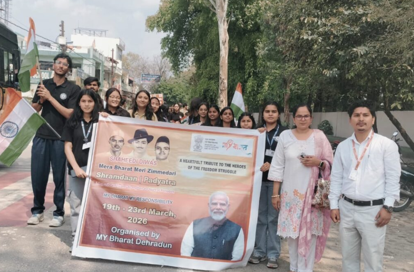 SGRRU देहरादून की सड़कों पर दिखी देशभक्ति की भावना और गूंजा देशभक्तों के जयकारे का उद्घोष जी हाँ मौक़ा था शहीदी दिवस का और टीम थी मेरा युवा भारत देहरादून की जिन्होंने श्री गुरु राम राय विश्वविद्यालय में पदयात्रा कर भारत और तिरंगे की शान में जोश और जज्बे की लहर भर दी …. इस शानदार कार्यक्रम में डीन स्टूडेंट वेलफेयर डॉ. मालविका बतौर मुख्य अतिथि उपस्थित रहीं। मेरा युवा भारत देहरादून की उपनिदेशक मोनिका नांदल ने बताया कि कार्यक्रम का शुभारंभ देश के महान स्वतंत्रता सेनानियों शहीद राजगुरु, भगत सिंह एवं सुखदेव के चित्रों पर पुष्प अर्पित कर किया गया। अतिथियों द्वारा युवाओं को देशभक्ति, कर्तव्यनिष्ठा एवं सामाजिक जिम्मेदारी के प्रति प्रेरित किया गया।