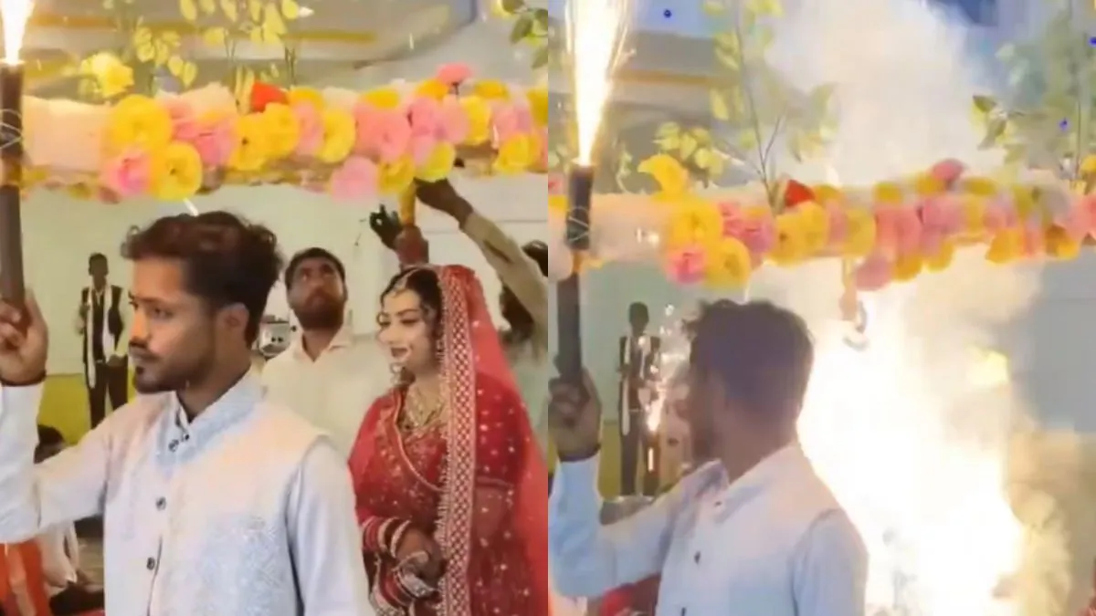 वायरल वीडियो में देखा जा सकता है कि वरमाला के लिए दुल्हन को लेकर परिजन स्टेज पर जा रहे हैं। डांस और म्यूजिक का माहौल बना हुआ है। दुल्हन के ऊपर एक फूलों और लाइट्स से सजी चादर लगी है, जिसे कुछ लोगों ने पकड़ रखा है। फूलों की चादर में मशाल लगी हुई है, जो फुलझड़ी की तरह जल रही है। इस दौरान कुछ ऐसा होता है कि दुल्हन का भाई खतरे में पड़ जाता है।