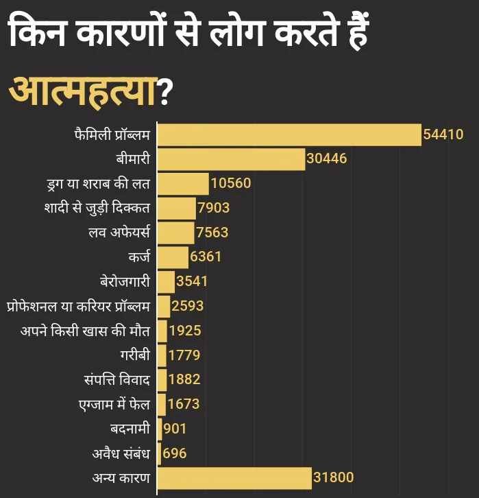 भारत में शादी के बाद पति-पत्नी को अक्सर कई चुनौतियों का सामना करना पड़ता है. ये दुश्वारियां ही विवाहित लोगों में सुसाइड की ऊंची दर का कारण बनती हैं. राष्ट्रीय अपराध रिकॉर्ड ब्यूरो (NCRB) के आंकड़ों के अनुसार भारत में 2016 से 2020 के बीच 37,000 से अधिक सुसाइड शादी से संबंधित मुद्दों के कारण हुए. विशेष रूप से 10,584 सुसाइड विवाह न होने के कारण और 10,282 दहेज से संबंधित मुद्दों के कारण हुए. जबकि 2,688 सुसाइड के मामले सीधे तलाक से संबंधित थे. आंकड़े बताते हैं कि विवाहित पुरुषों में सुसाइड की आशंका विवाहित महिलाओं की तुलना में अधिक होती है. इसका कारण अक्सर सामाजिक दबाव और आर्थिक तनाव होता है.